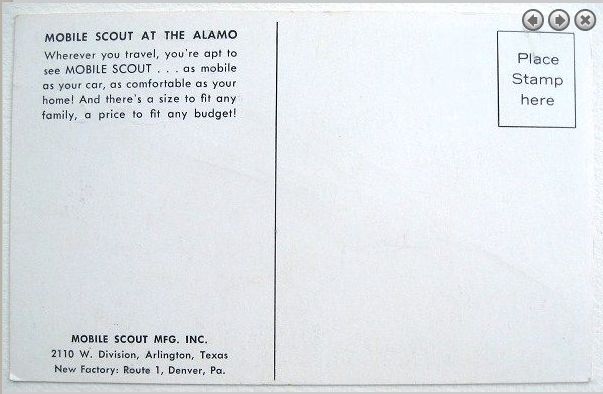From documents I've found, we know that Mobile Scout Manufacturing Corp. was building Mobile Scout campers in various lengths and configurations from the late 50's through the 60's. Camper building back in that day was a bit different from manufacturing today; given the variety of interiors and structural details, they appear to have been built with whatever resources were on hand -- the framing in ours, which we exposed when we took the skin of and the interior out in order to replace some rot -- was clearly whatever wood they had around, some clearly recycled. I've never been able to pinpoint how many of these vintage models were produced.A postcard does suggest that they were booming; an ad-postcard for Mobile Scout Manfacturing Corp notes their Arlington, Texas address and the opening of a new plant in Pennsylvania (circa mid 60's?).
